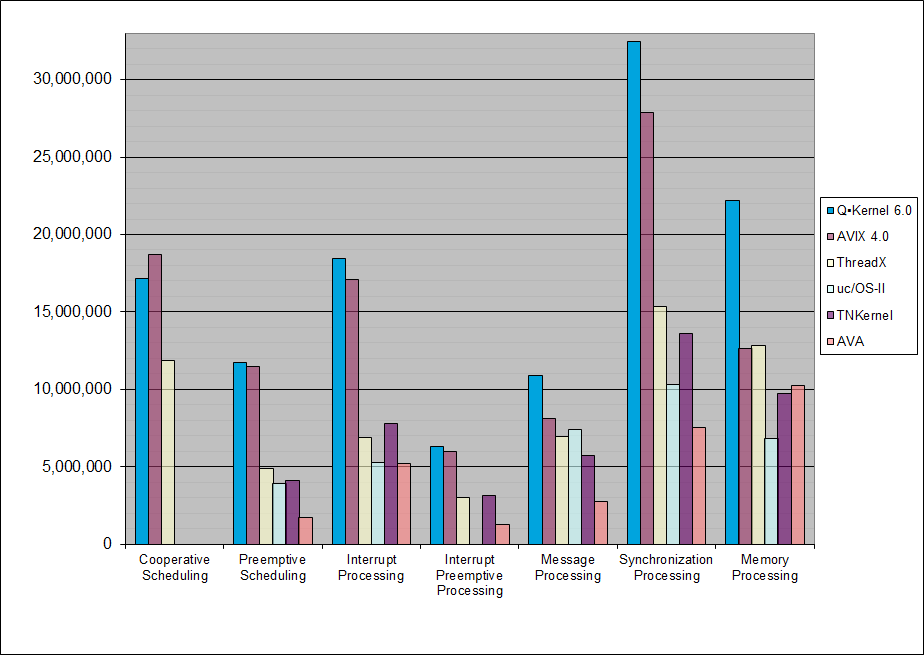 Performance testing to compare different RTOS is not simple. Some systems implement features that are not tested at all, some system do more error checking, etc. has been tested based on the open source Thread-Metric benchmark test-suite produced by Express-Logic Inc.